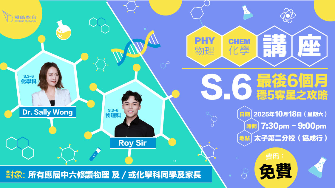 [vc_row css_animation="" row_type="row" use_row_as_full_screen_section="no" type="full_width" angled_section="no" text_align="left" background_image_as_pattern="without_pattern"][vc_column][vc_column_text]話咁快,淨返大概6個月,2026DSE就殺到。有修讀物理、化學嘅S.6同學,你哋準備成點?有無信心穩5奪⭐?想趁為時未晚,搵一個適合你嘅補習老師,急起直追?呢個講座就最適合你喇!留低你對物理、化學科最後衝刺嘅疑問,將有機會喺講座回答![/vc_column_text][vc_empty_space height="20px"][button size="big_large_full_width" target="_self" hover_type="default" text="立即報名" link="https://forms.gle/RRFY9pApAgoVwvNZA" hover_color="#ffffff" background_color="#7890f4" hover_background_color="#fbe44c" border_color="#ffffff"][vc_empty_space height="20px"][button size="big_large_full_width" target="_self" hover_type="default" text="Dr Sally Wong 導師簡介" link="https://www.definingeducation.com.hk/portfolio_page/sally-wong/" hover_color="#ffffff" background_color="#26d9c4" hover_background_color="#fbe44c" border_color="#ffffff"][vc_empty_space height="20px"][button size="big_large_full_width" target="_self" hover_type="default" text="Roy Sir 導師簡介" link="https://www.definingeducation.com.hk/portfolio_page/roy-sir/" hover_color="#ffffff" background_color="#0091d0" hover_background_color="#fbe44c" border_color="#ffffff"][vc_empty_space height="20px"][/vc_column][/vc_row][vc_row css_animation=""...