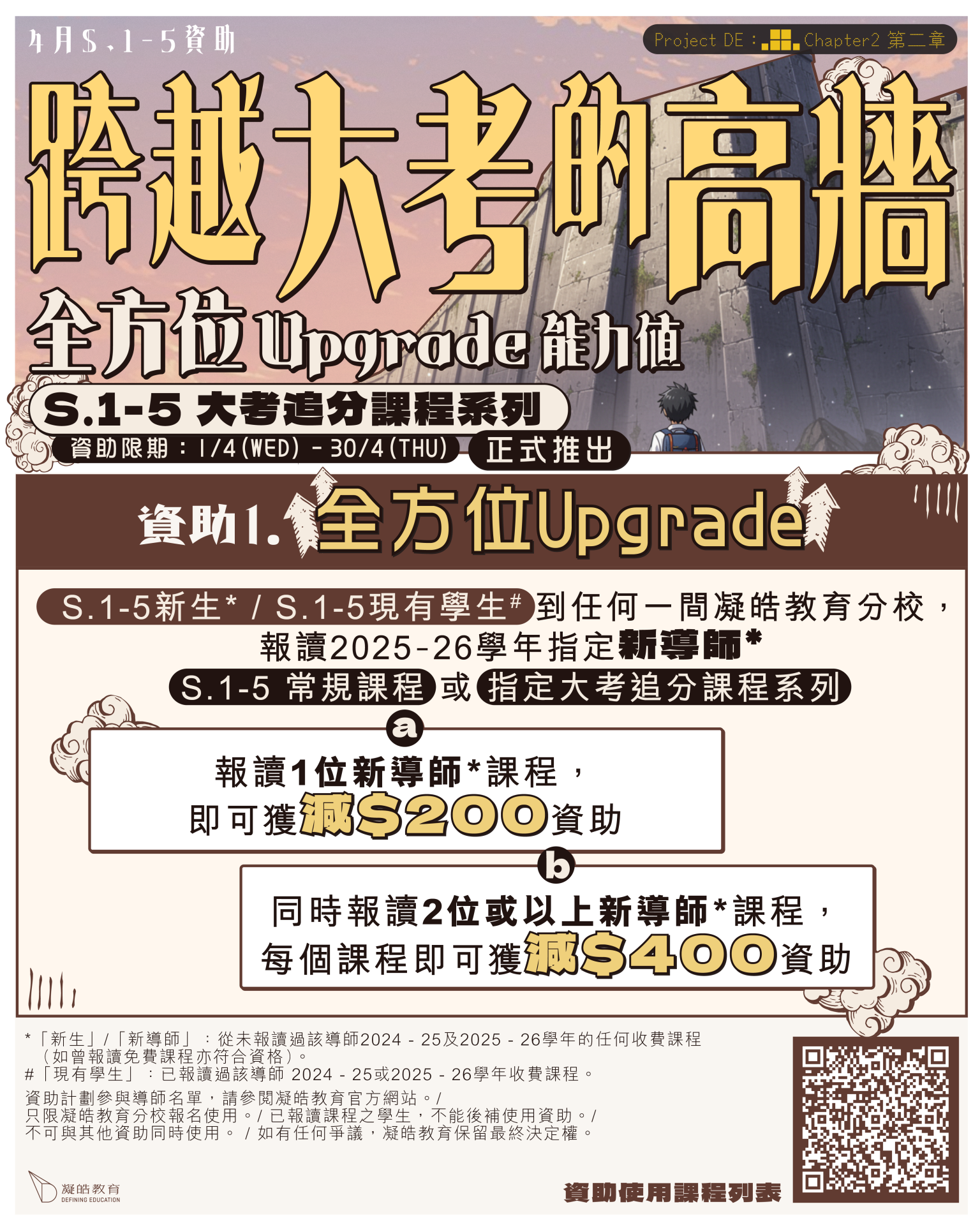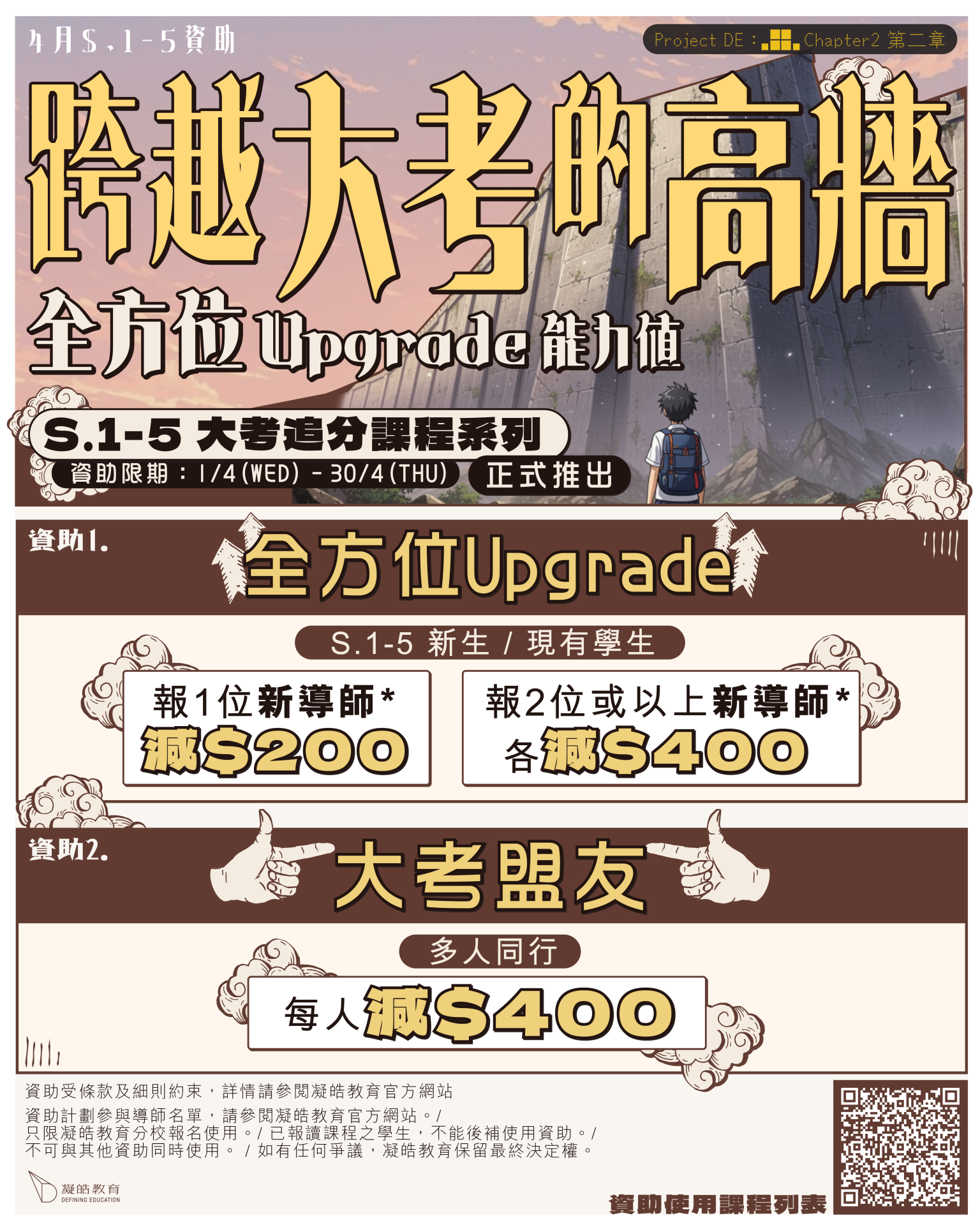 31 三月 【4月資助】ProjectDE EP2|多人同行各減$400|報新導師減$200 Posted at 21:29h in frontpagenews, 最新活動及優惠 by admin admin 0 Comments 0 Likes 新生註冊 新生攻略! 網上平台使用指引 資助使用課程列表 S.1-5 大考追分課程列表