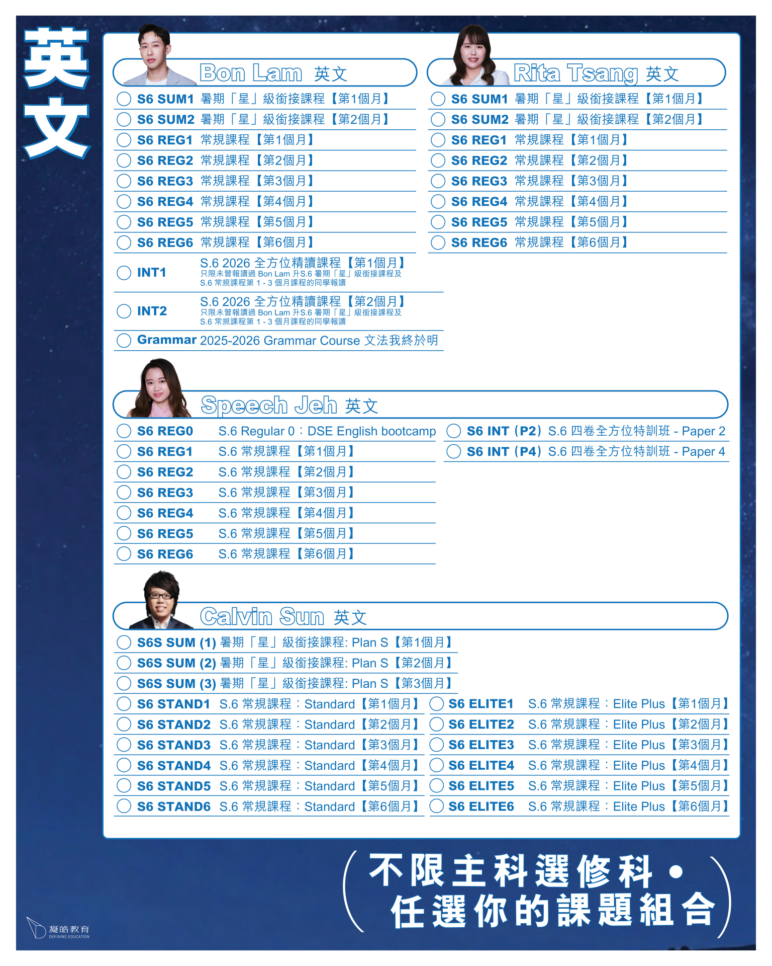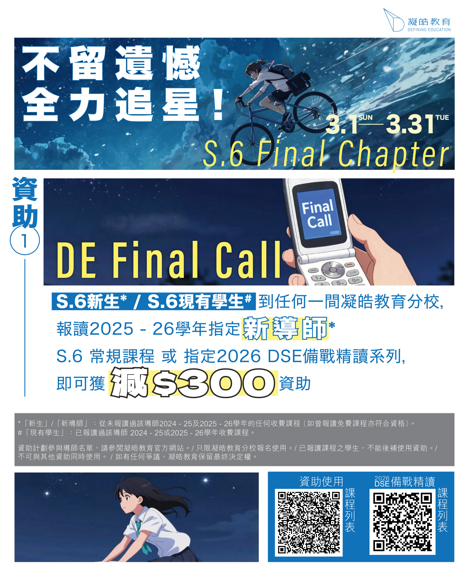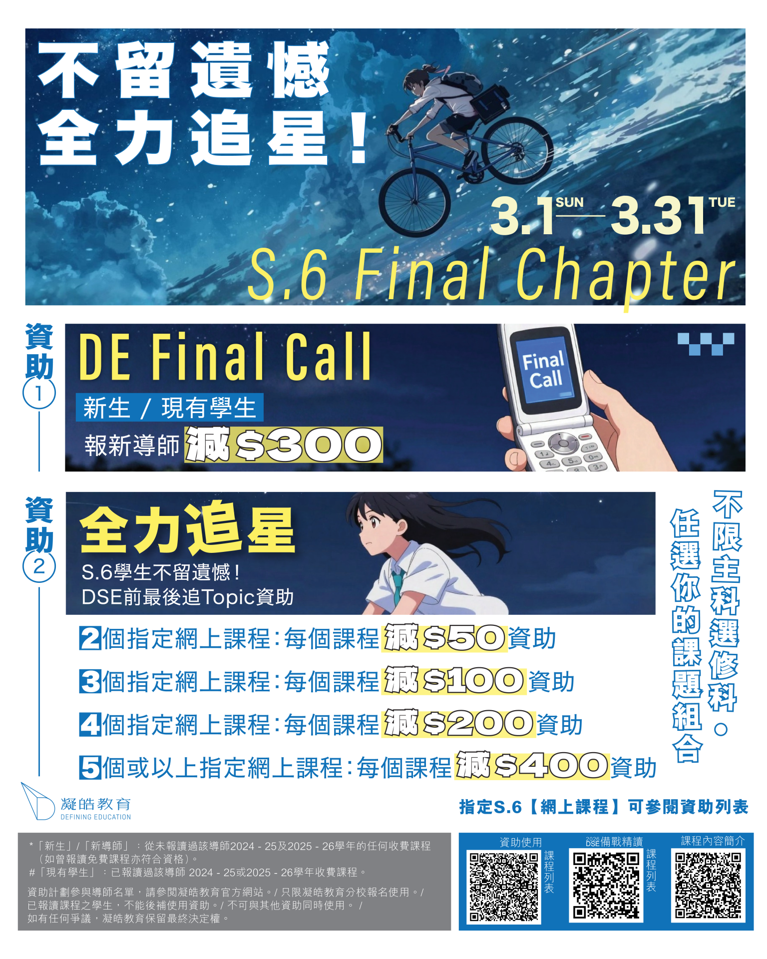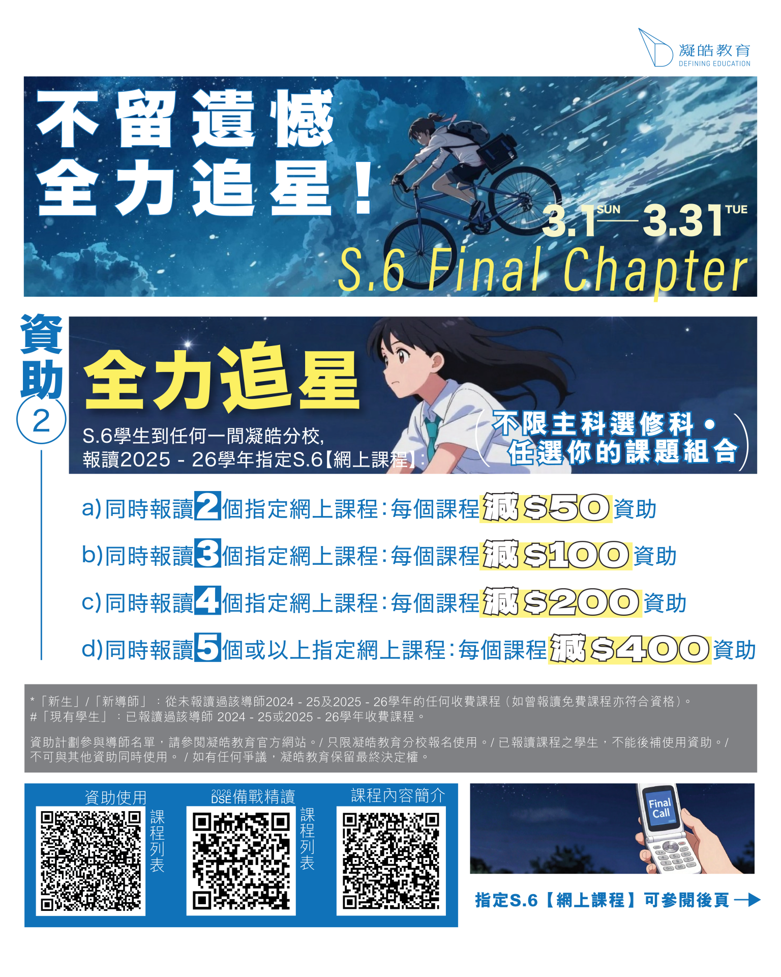 28 二月 【3月S.6資助】全力追星|每個網上課程最高減$400|報新導師減$300 Posted at 20:57h in frontpagenews, 最新活動及優惠 by admin admin 0 Comments 0 Likes 新生註冊 新生攻略! 網上平台使用指引 資助使用課程列表 2026 DSE備戰精讀系列 詳細內容