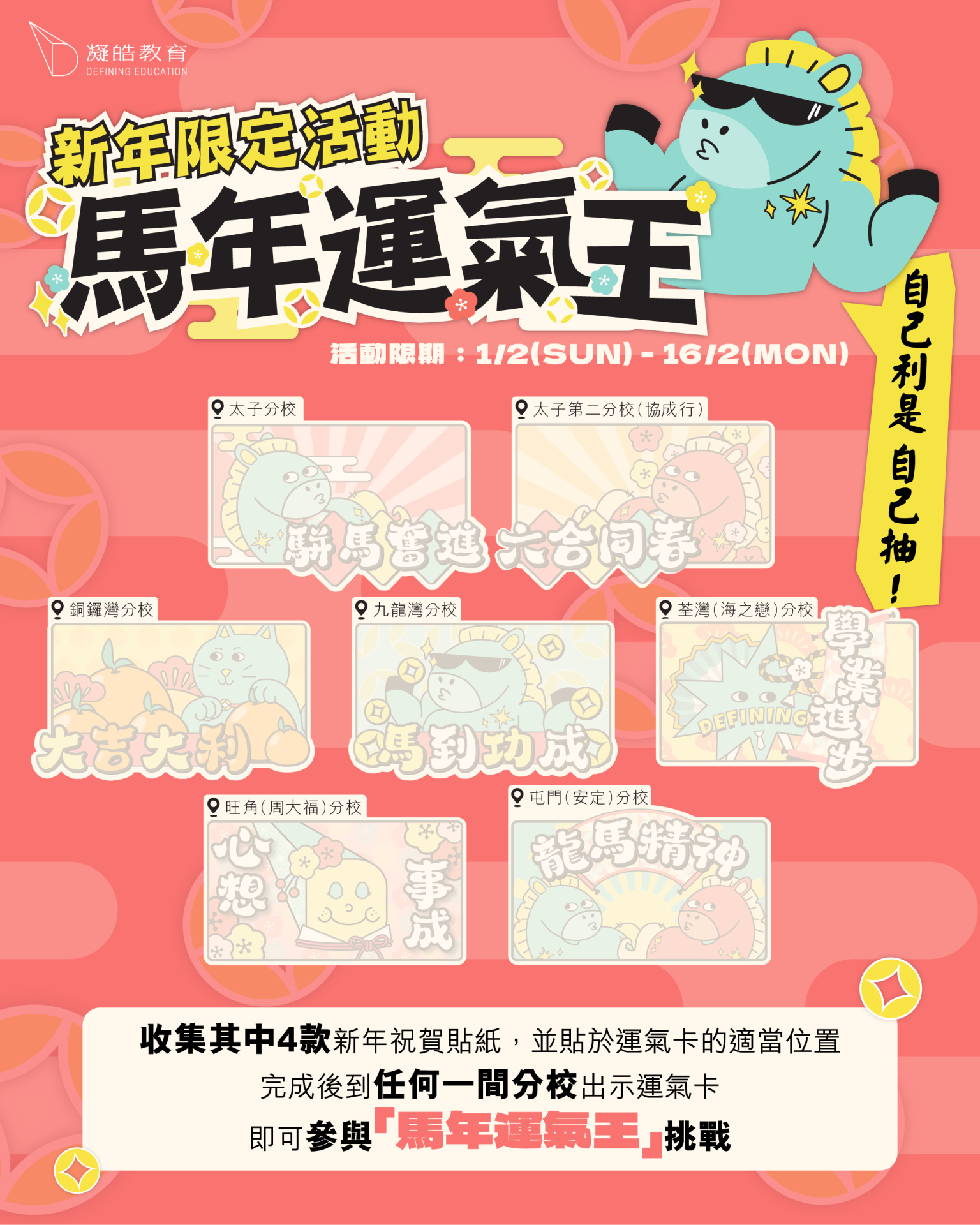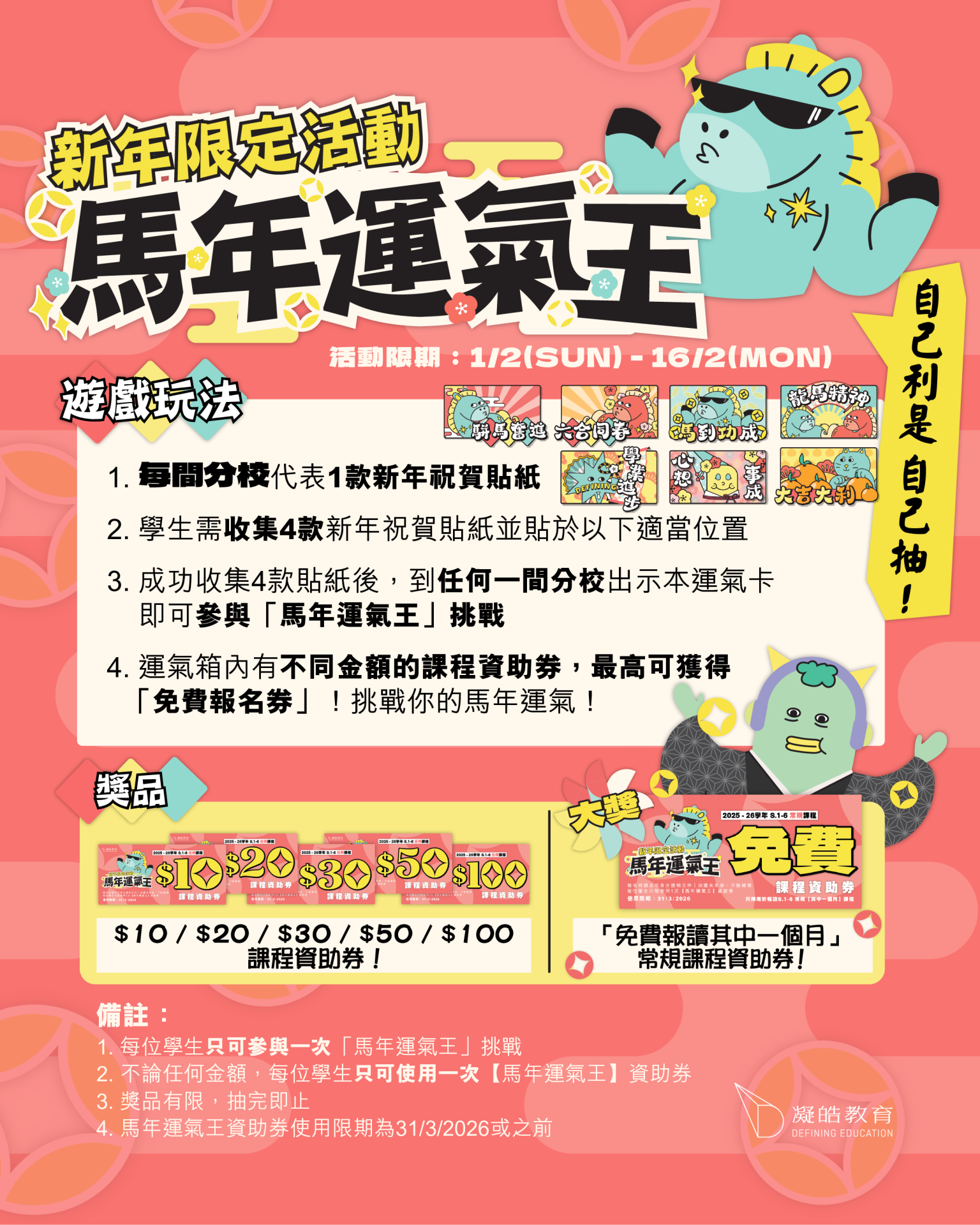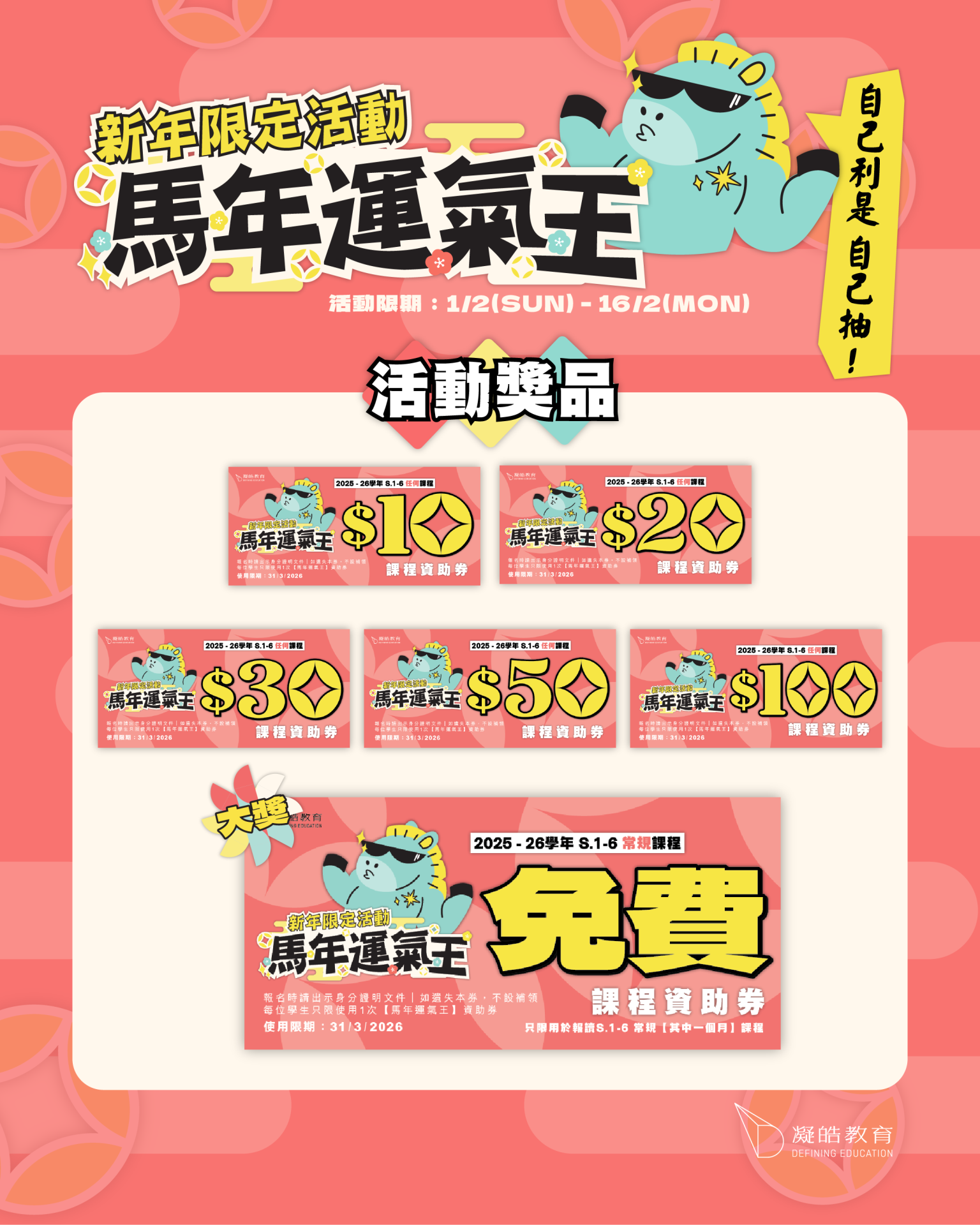 31 一月 【新年限定活動】馬年運氣王|大獎可獲免費課程券! Posted at 21:29h in frontpagenews, 最新活動及優惠 by admin admin 0 Comments 0 Likes
