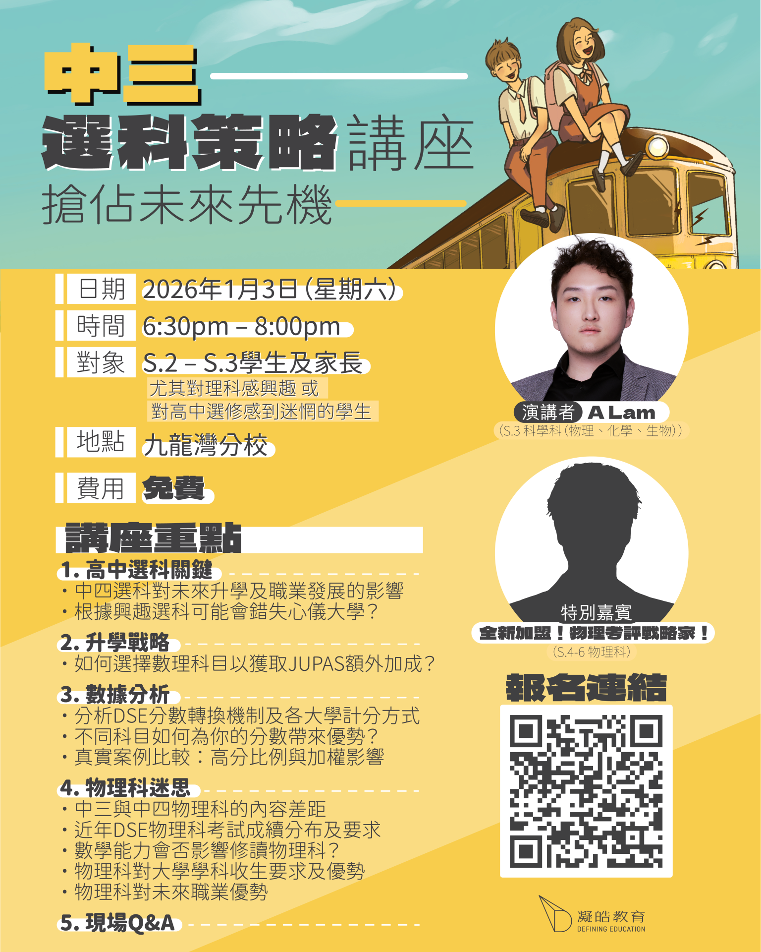 21 十二月 【立即報名】中三選科策略講座──搶佔未來先機|A.Lam X 特別嘉賓 Posted at 19:07h in frontpagenews, 最新活動及優惠 by admin admin 0 Comments 0 Likes 中三選科應該按照興趣、衡量能力抑或是考慮出路?A.Lam老師與神祕嘉賓老師會從JUPAS各大院校加成科目、文憑試DSE成績分佈數據、未來就業趨勢、就業所需專業學科知識等多角度分析,教你認識考進大學的遊戲規則,從而制定合適自己的選科策略。此外,講座亦會分享數理科的學科內容,梳理物理、化學、生物 以及 M1、M2之間的分別,讓你更有效地選擇合適自己的科目。 立即報名 A.Lam 簡介 A.Lam 課程內容及時間表