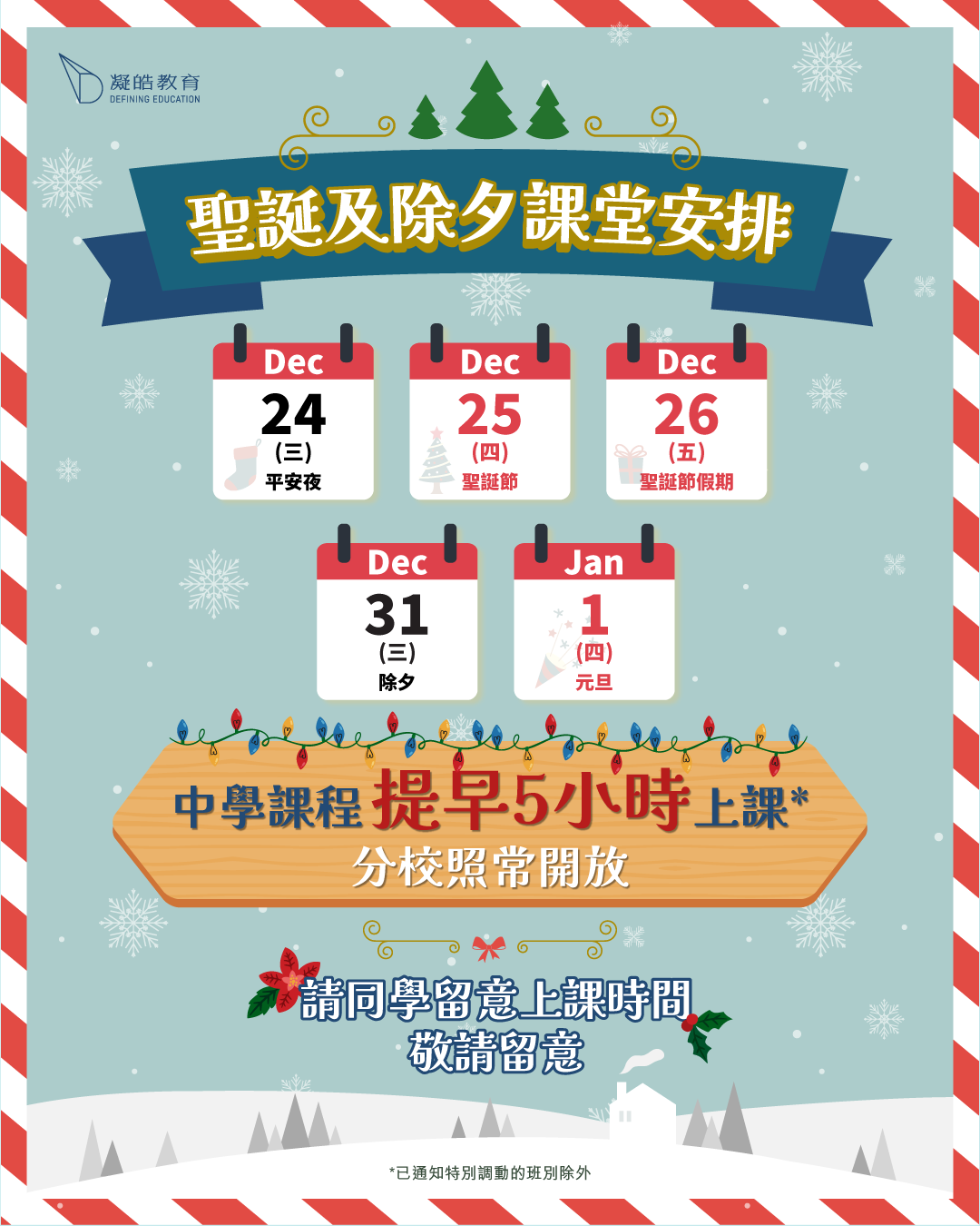 17 十二月 【重要】聖誕及除夕課堂安排🎄 Posted at 17:13h in frontpagenews by admin admin 0 Comments 0 Likes 🎄聖誕及除夕課堂安排🎄【中學課程】當日課堂提早5️⃣小時上課*,分校照常開放,請同學留意上課時間😊 12月24日(星期三)平安夜🔔 12月25日(星期四)聖誕節⛄ 12月26日(星期五)聖誕節假期🎁 12月31日(星期三)除夕🎆 1月1日(星期四)元旦🎉 *已通知特別調動的班別除外 #DefiningEducation #凝皓教育