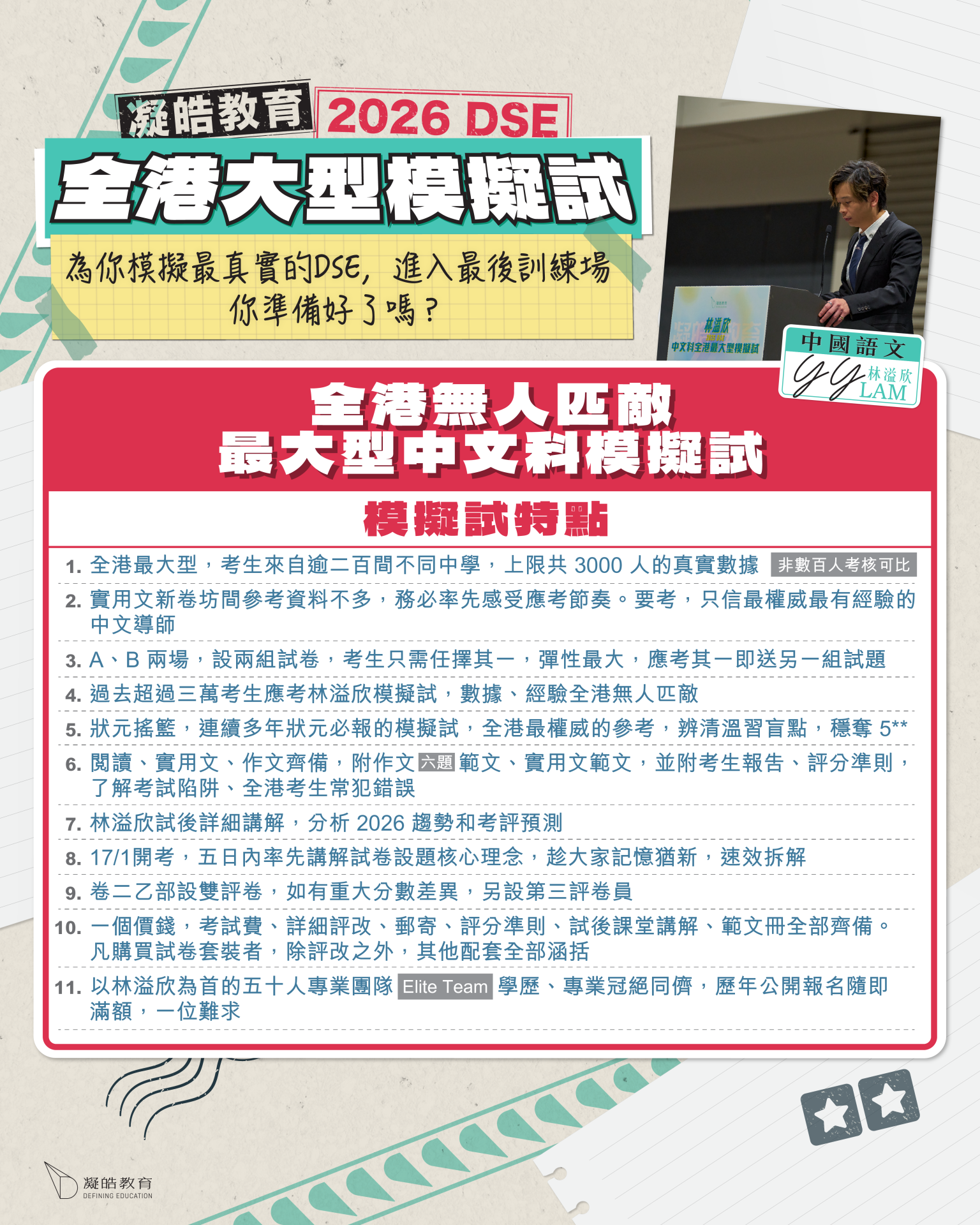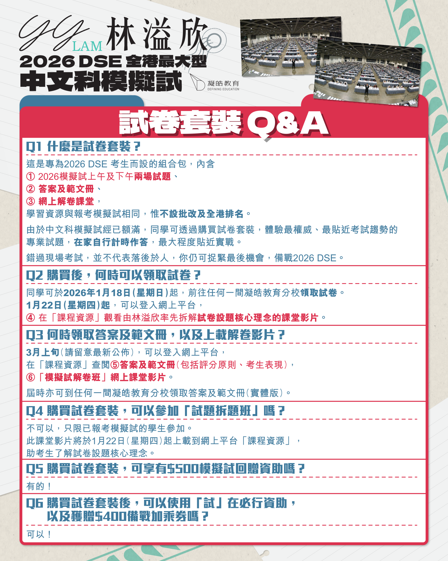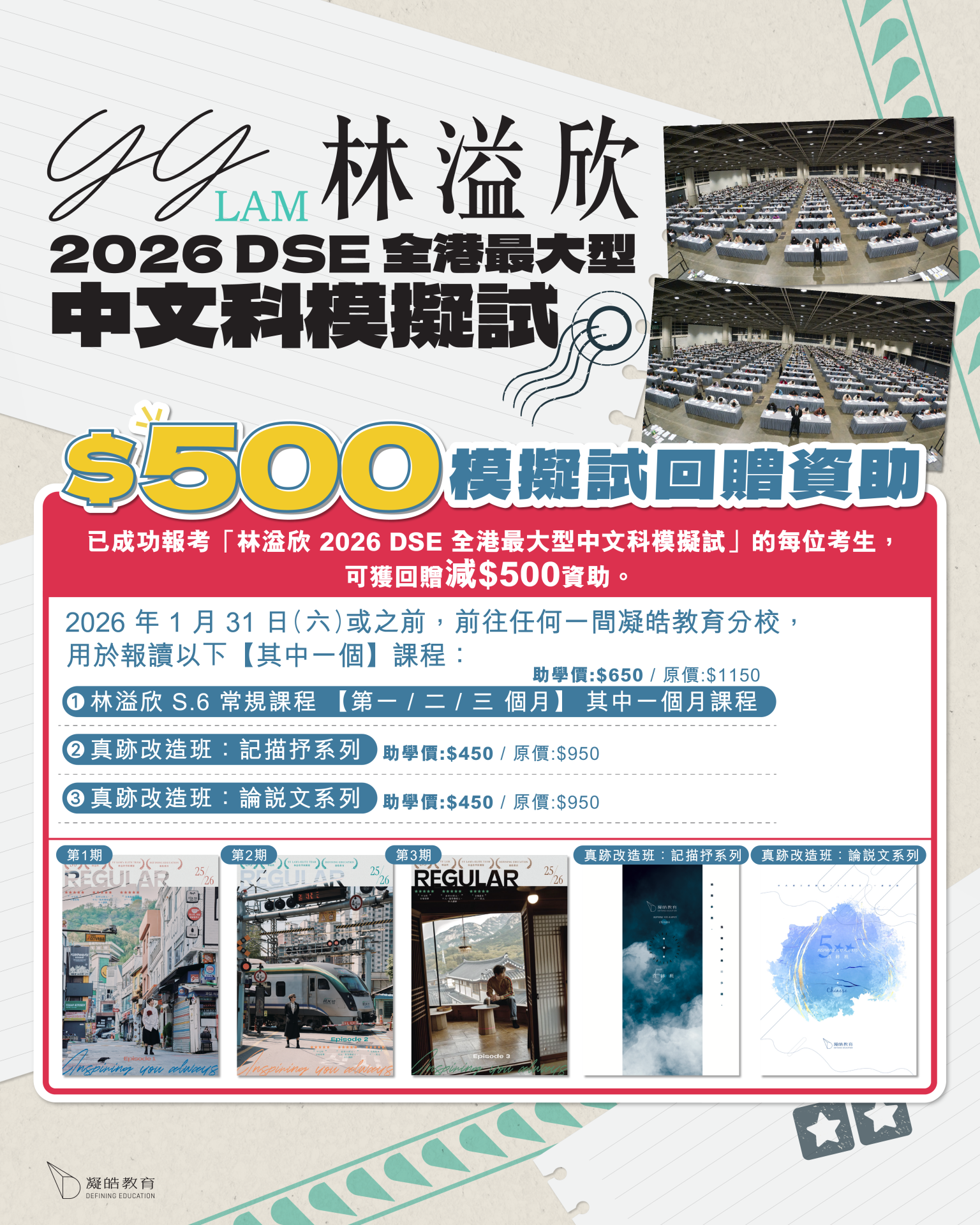 - 已購買「林溢欣 2026 DSE 全港最大型中文科模擬試(試卷套裝)」的同學,可獲回贈減$500 助學金。2026 年 1 月 31 日(六)或之前,前往任何一間凝皓教育分校,用於報讀以下【其中一個】課程:林溢欣 S.6 常規【第一/二/三個月】其中一個月課程(助學價:$650 / 原價:$1150)
