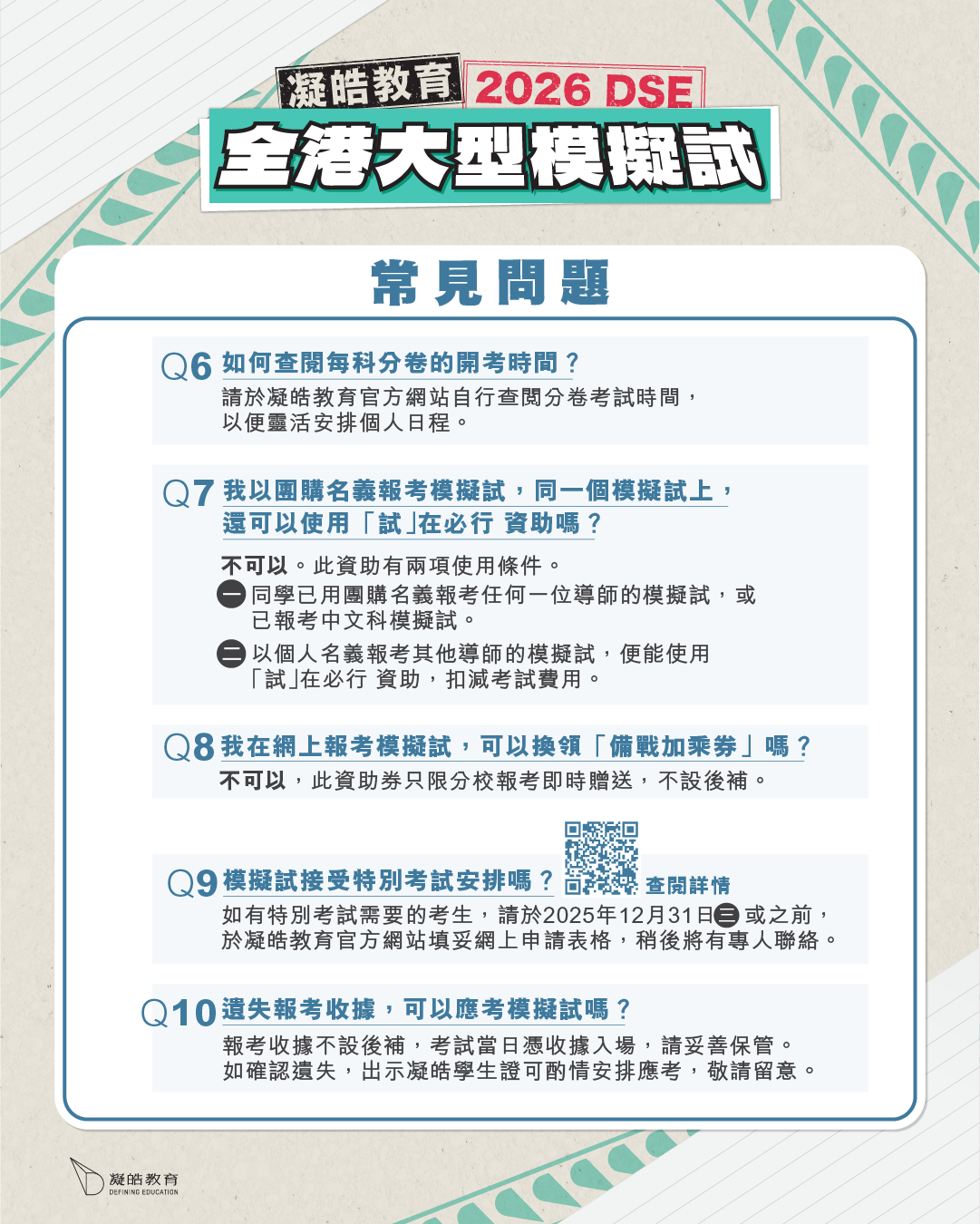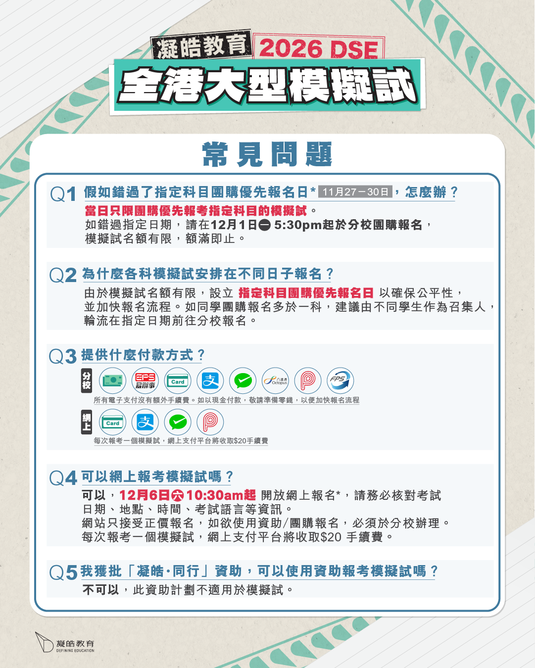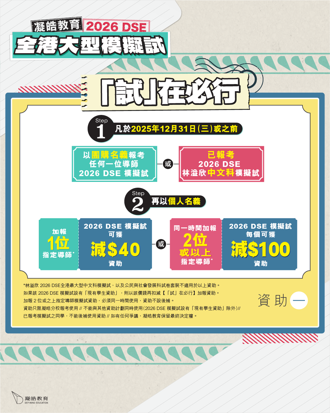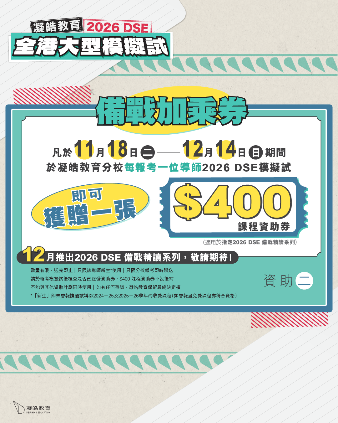 凡於11月18日(二)至12月14日(日)期間,於凝皓教育分校每報考一位導師 2026 DSE 模擬試,即可獲贈一張$400 課程資助券(適用於指定2026 DSE 備戰精讀系列)