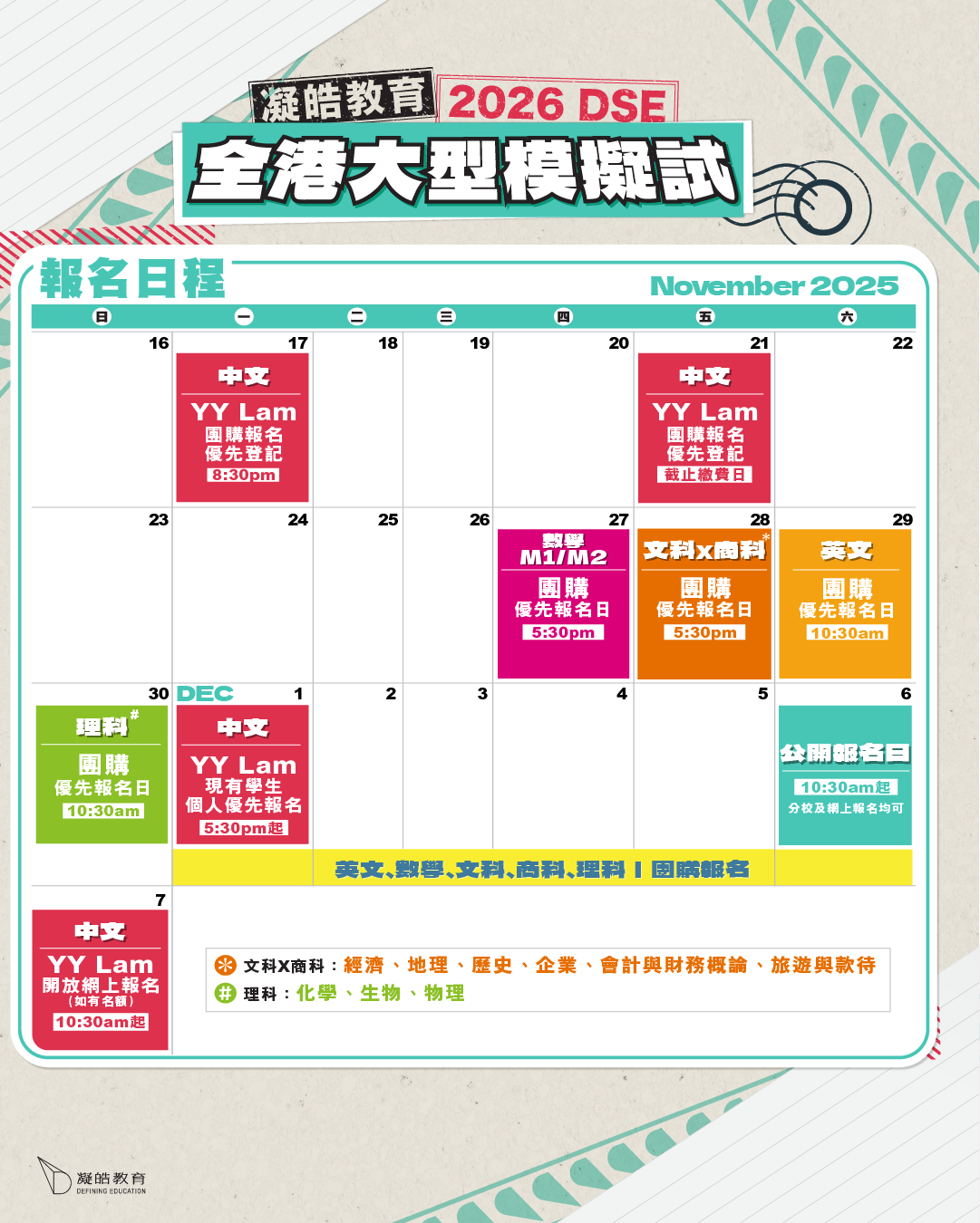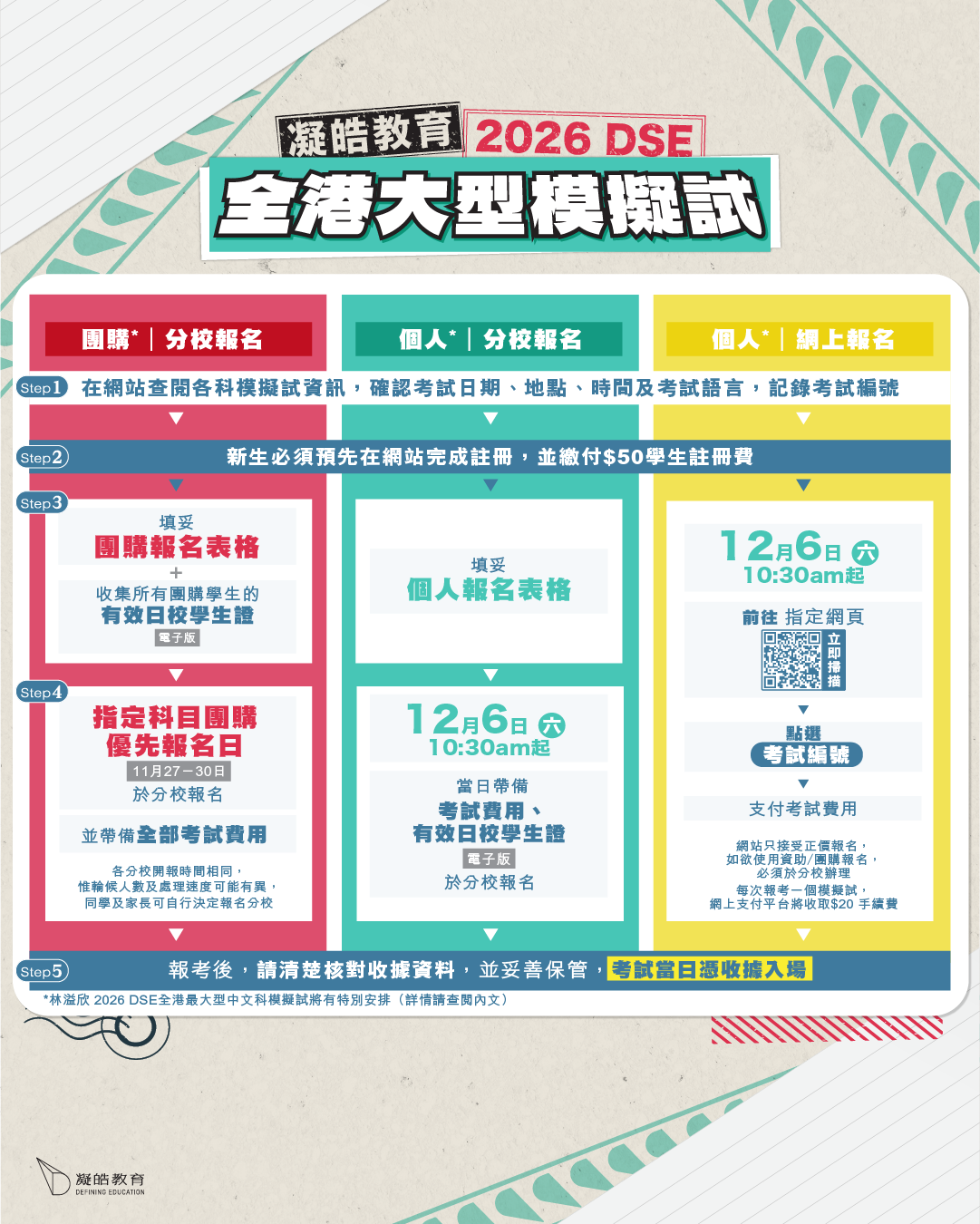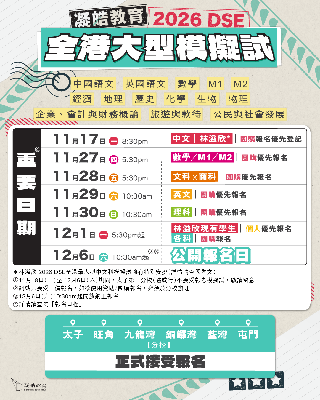 1. 林溢欣 2026 DSE 全港最大型中文科模擬試團購考生11月17日(一)8:30pm起,可於凝皓教育官方網站優先登記,成功登記之考生,將有專人聯絡召集人,並於11月21日(五)或之前到校繳費。
