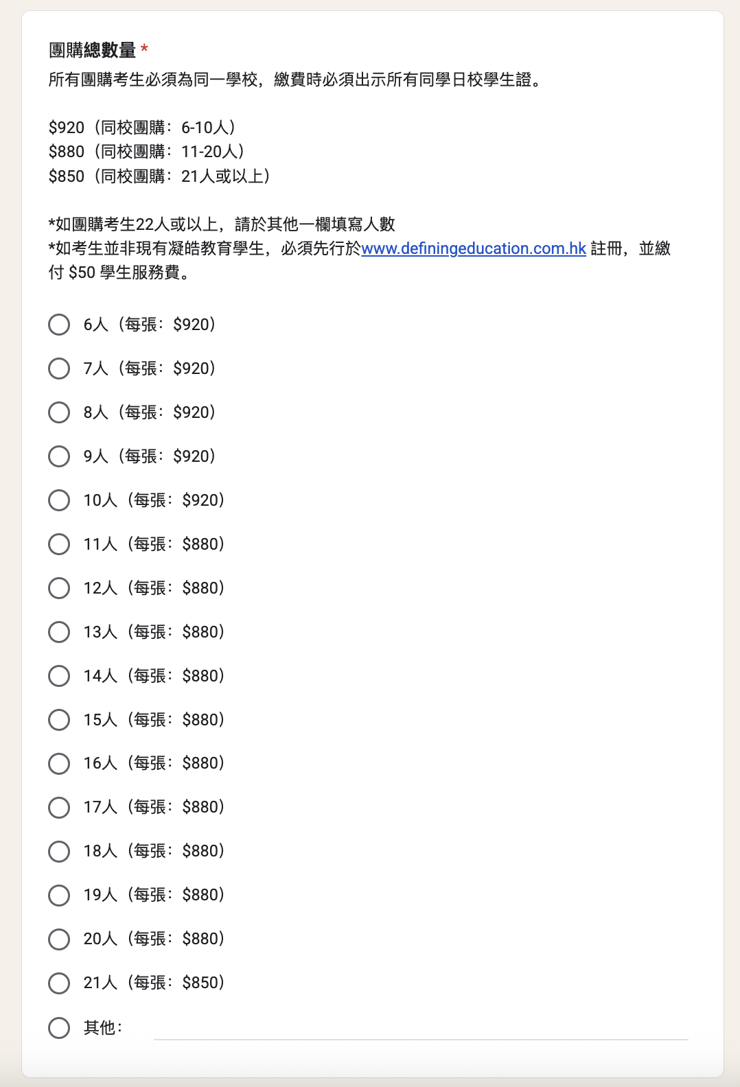 * 如考生並非現有凝皓教育學生,請於繳費前到www.definingeducation.com.hk 註冊,並於當日或之前繳付 $50 學生服務費。