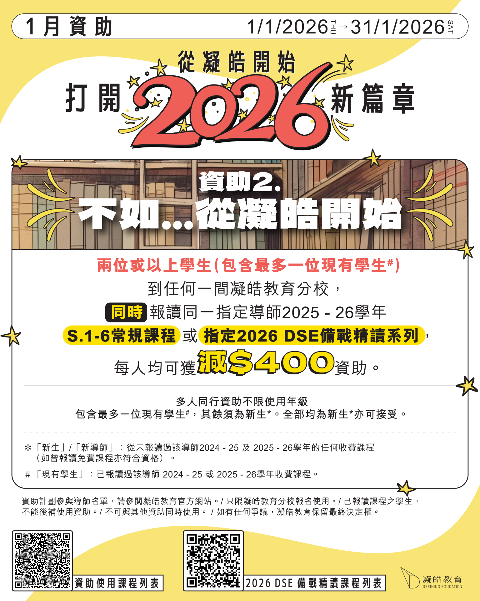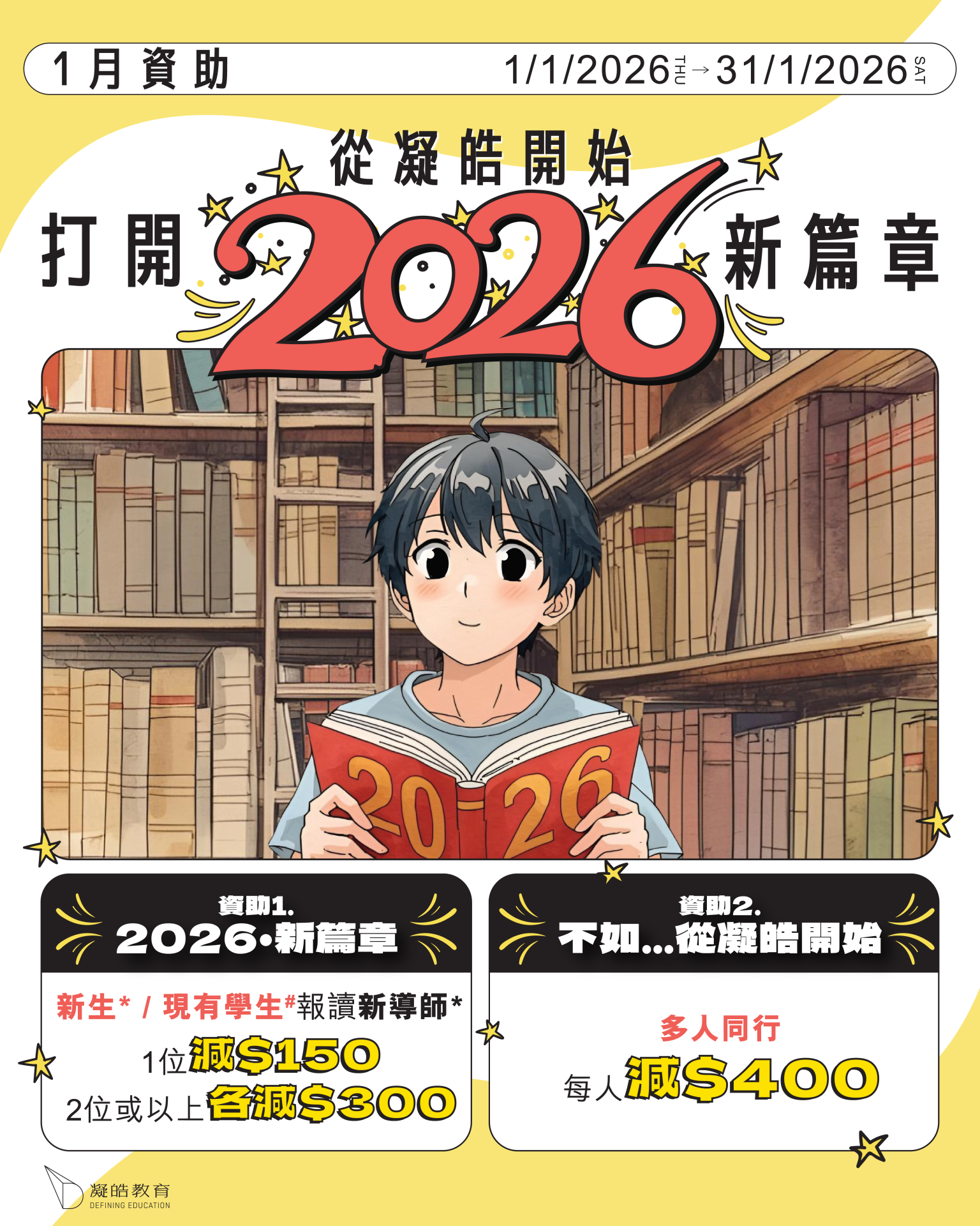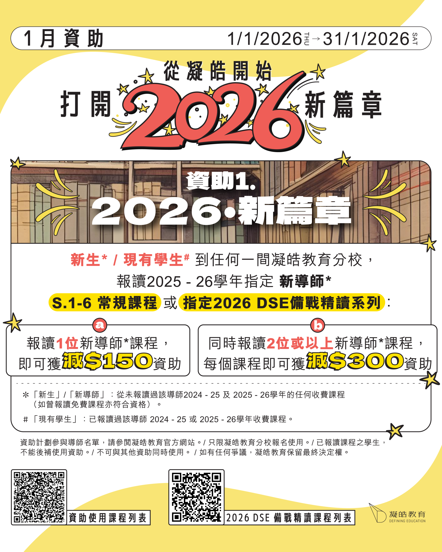 01 一月 【1月資助】報讀新導師最高減$300|多人同行,每人減$400 Posted at 10:36h in frontpagenews, 最新活動及優惠 by admin admin 0 Comments 0 Likes 新生註冊 新生攻略! 網上平台使用指引 資助使用課程列表 2026 DSE 備戰精讀系列 課程列表