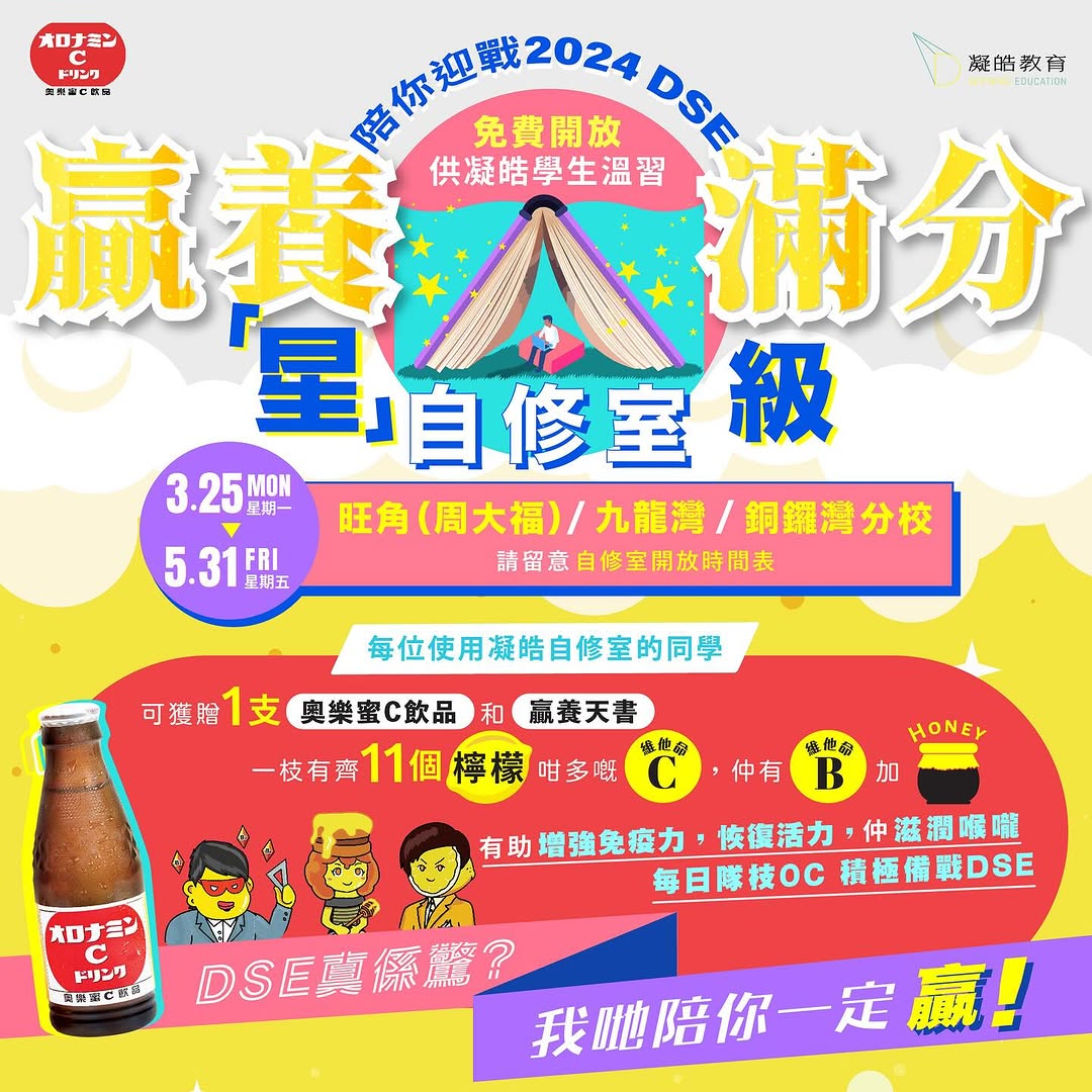 凝皓教育日本維他命及營養碳酸飲品奧樂蜜 C合作,推出DSE打氣活動,向逾萬位學生派發飲品。