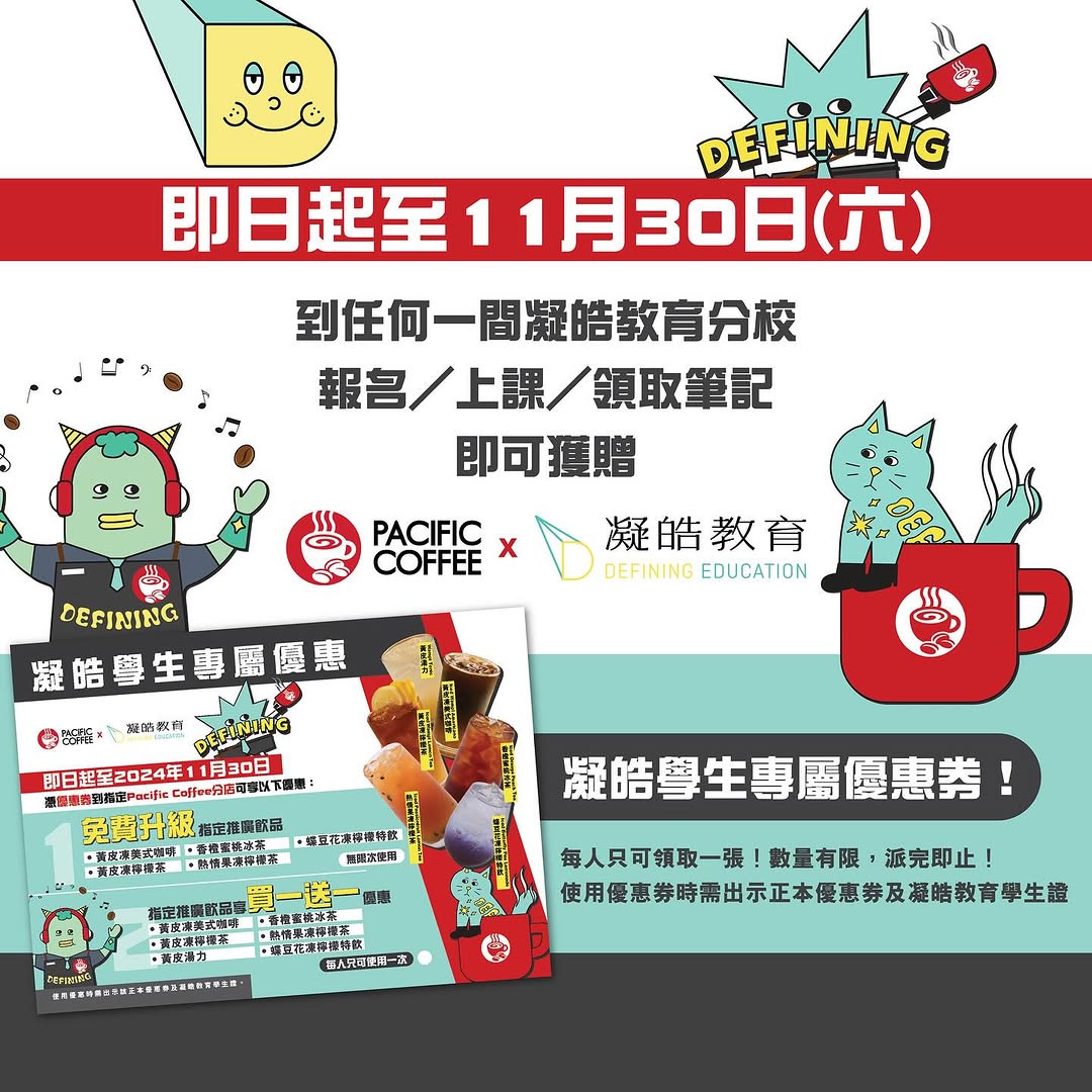 凝皓教育與連鎖咖啡品牌Pacific Coffee跨界合作,為DSE考生推出應援系列,包括打氣飲品、限定自修室、專屬優惠。